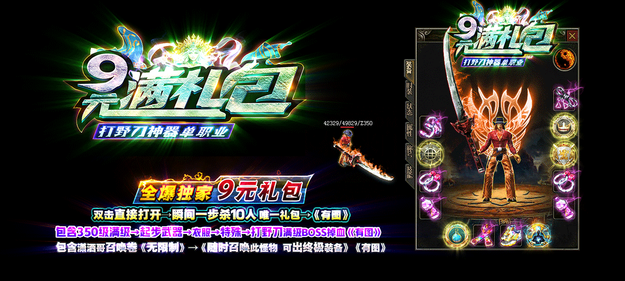 • 9元礼包→包含潇洒哥召唤卷《无限制》→《随时召唤此怪物,可出终极装备